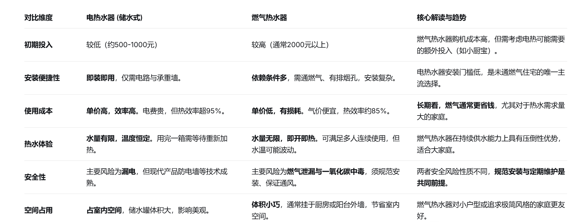 电与燃气的抉择,本质是在初始成本与长期能耗、安装条件与使用体验、即热需求与空间占用之间寻找最佳平衡点。对于大多数已通燃气、人口较多的中国家庭而言,燃气热水器在长期使用的经济性、便利性和体验上的综合优势更为明显。然而,最终答案必须写进您家的户型图、水电管线图和日常生活习惯里。